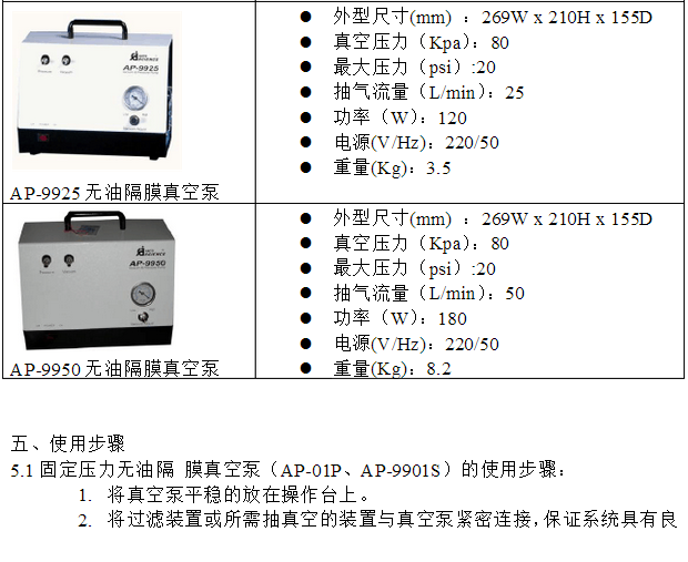 5.2可調(diào)壓力無(wú)油隔膜真空泵(AP-01D、AP-02B、AP-9925、AP-9950)的使用步驟: